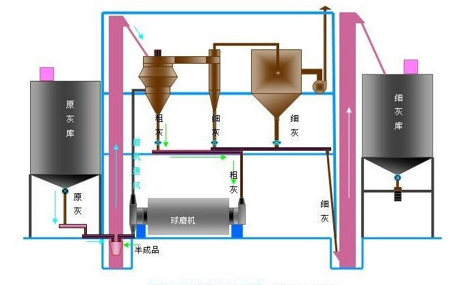 用球磨機進行粉體磨細,這在水泥行業已經應用多年,技術成熟,磨機產品已經相對系列化。借鑒國內外多種高細高產水泥磨機的原理和結構,鹽城市鹽富公司科研部門聯合了國內粉煤灰綜合應用名院校南京工業大學材料科學系,成功研制開發了粉煤灰細磨專用的球磨機,將燃煤電廠排放的原灰或者粗灰進行磨細,達到成品灰細度。在球磨機后增設一臺分選設備,將經過球磨機研磨過的煤灰進行分選,分選后將粗灰重新返回球磨機進行超細研磨,生產出能配制高性能砼的 摻合料(微粉),大大提高了粉煤灰綜合利用的經濟效益,能夠實現粉煤灰的全部綜合利用。